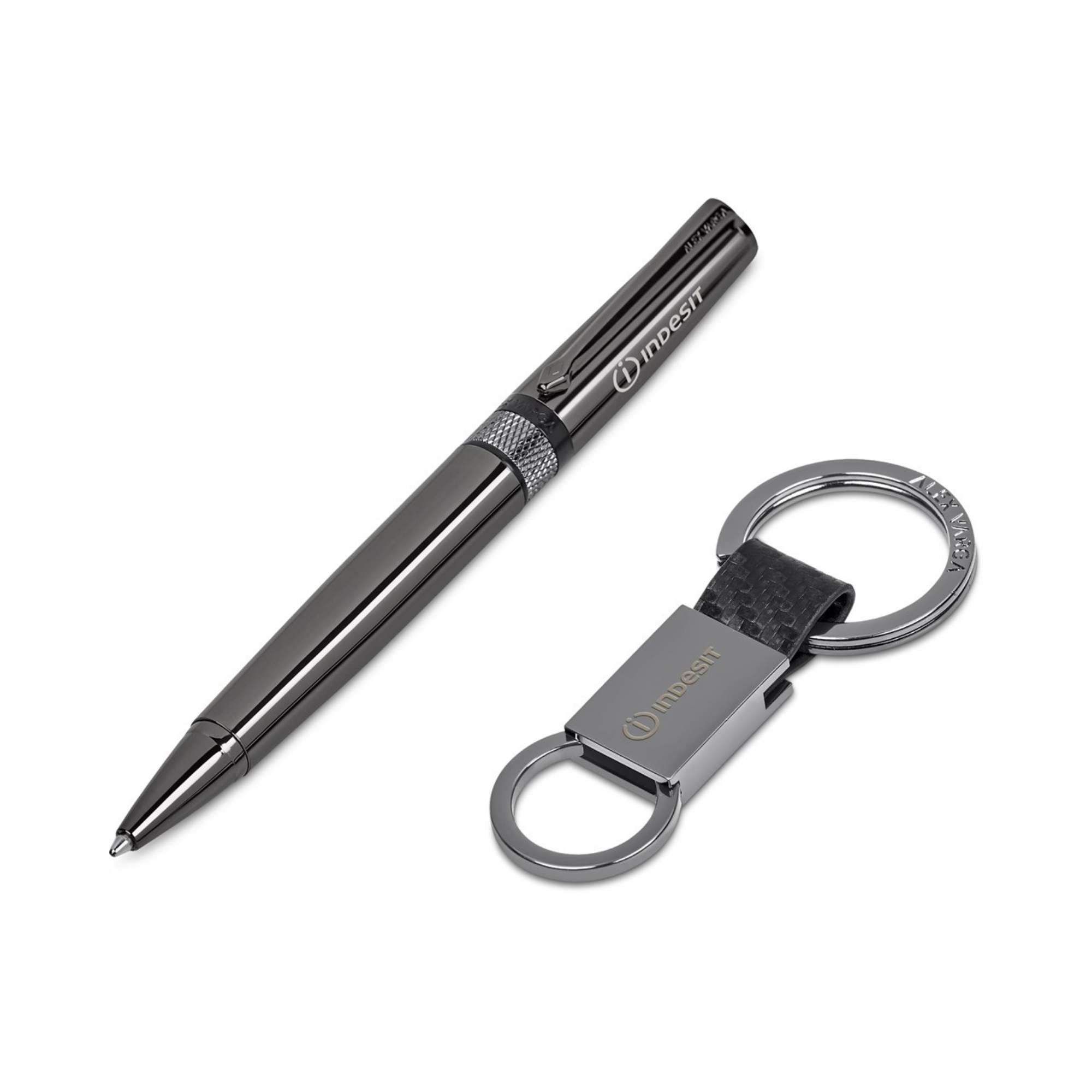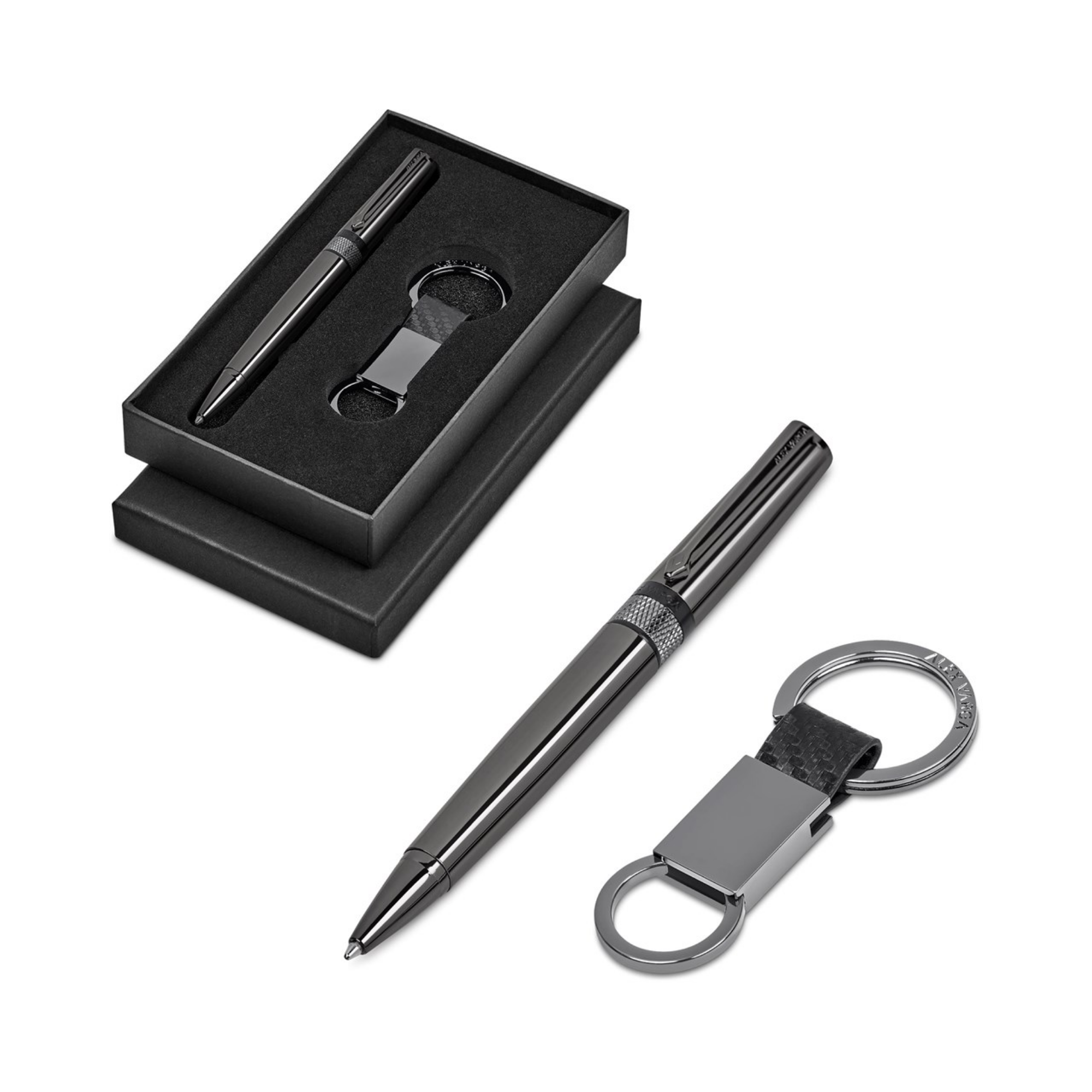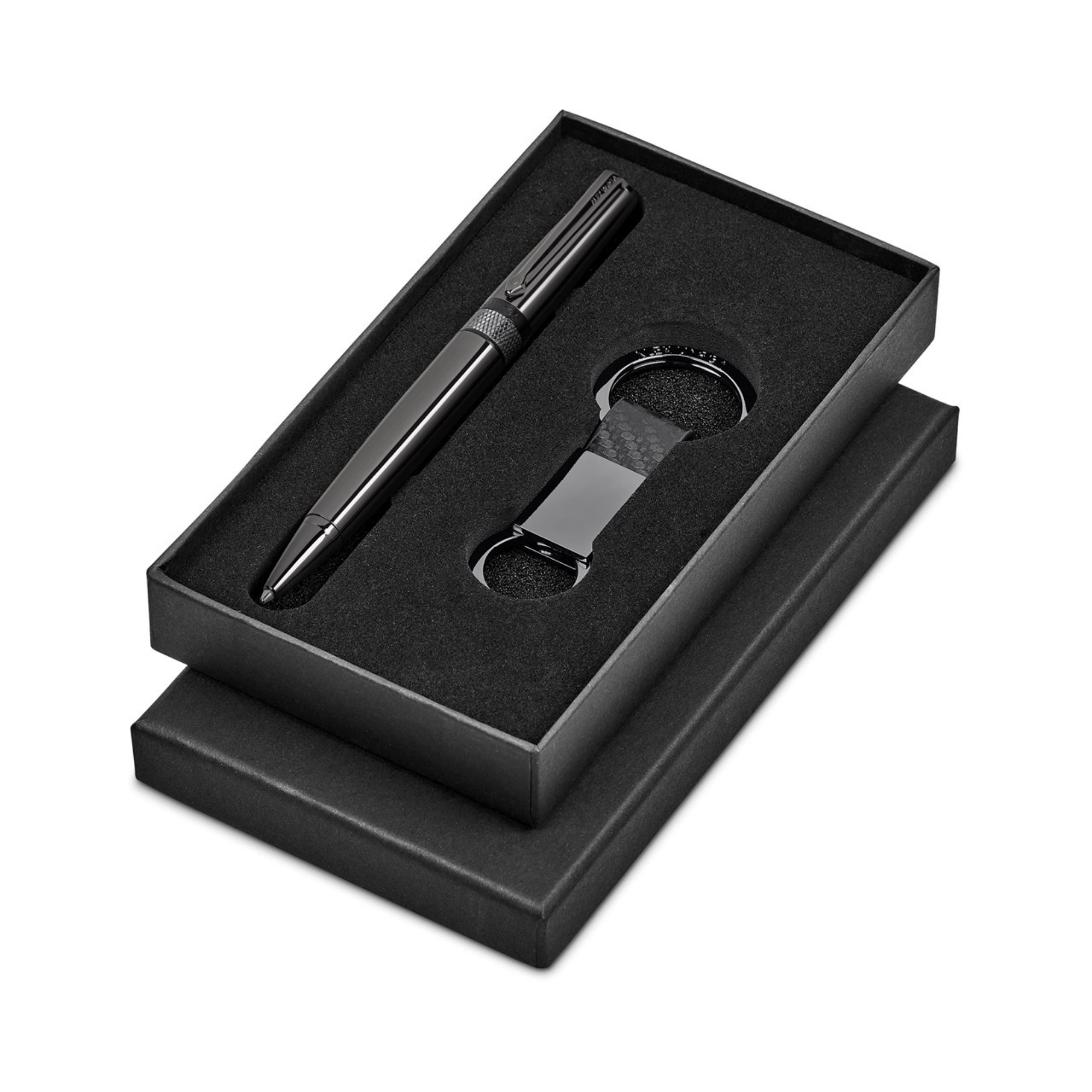 A high quality ball pen and a carbon fibre-look keyholder are packaged together in an elegant black, 2-piece presentation box.