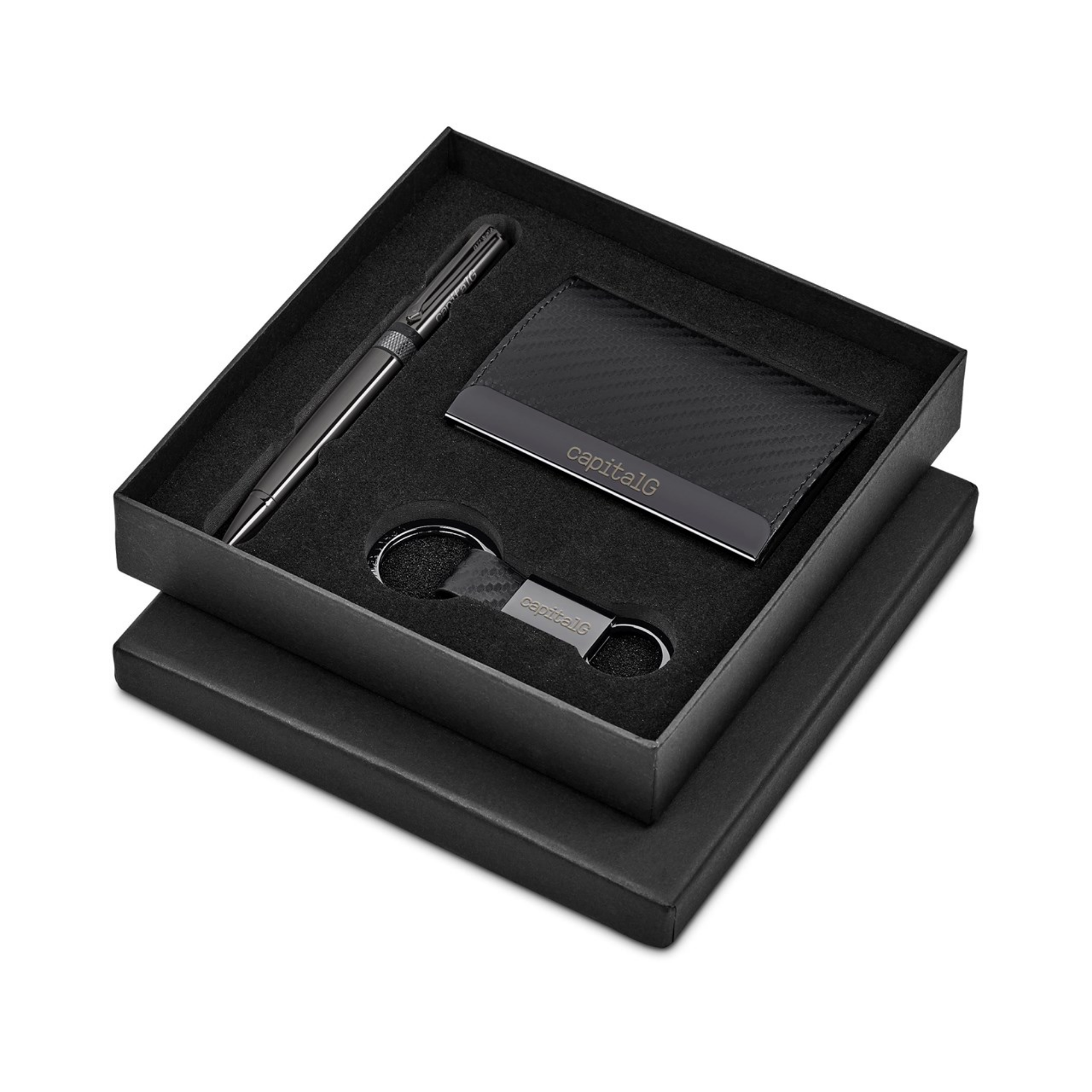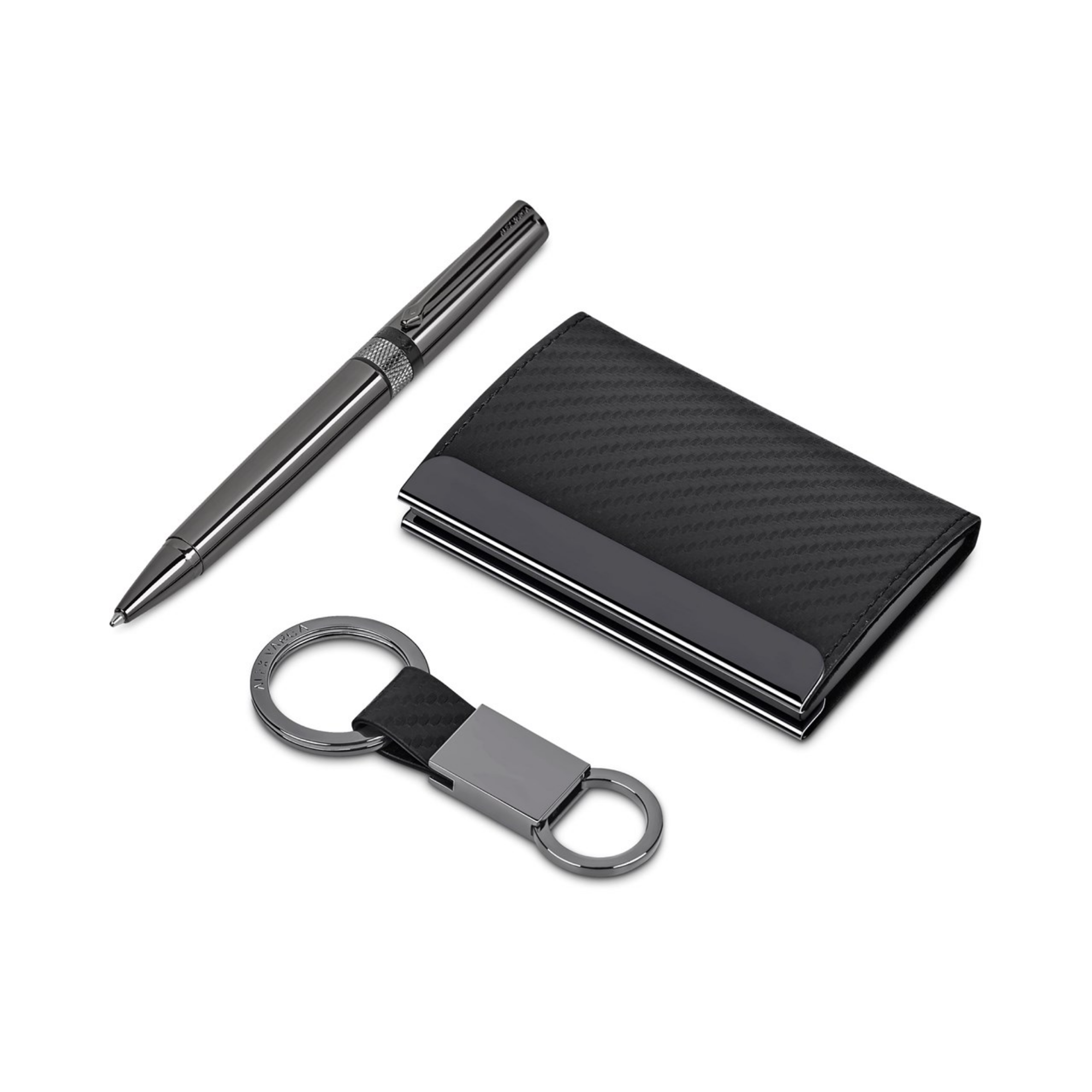 A high quality ball pen is combined with a carbon fibre-look keyholder and card holder in an elegant black, 2-piece presentation box.