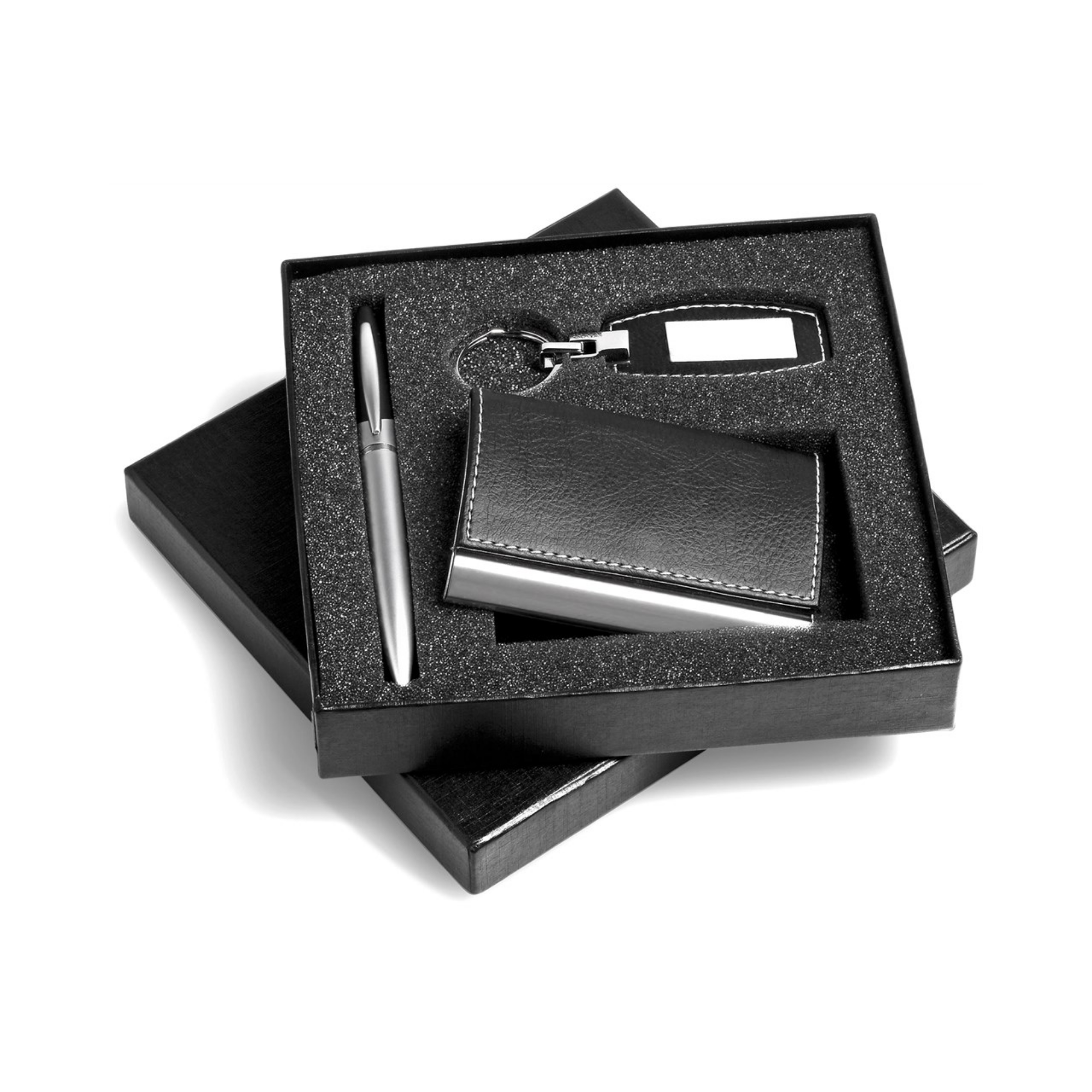 Three executive-style, daily use items are presented together in a 2-piece gift box. Includes a business card holder, a keyholder and a ball pen.