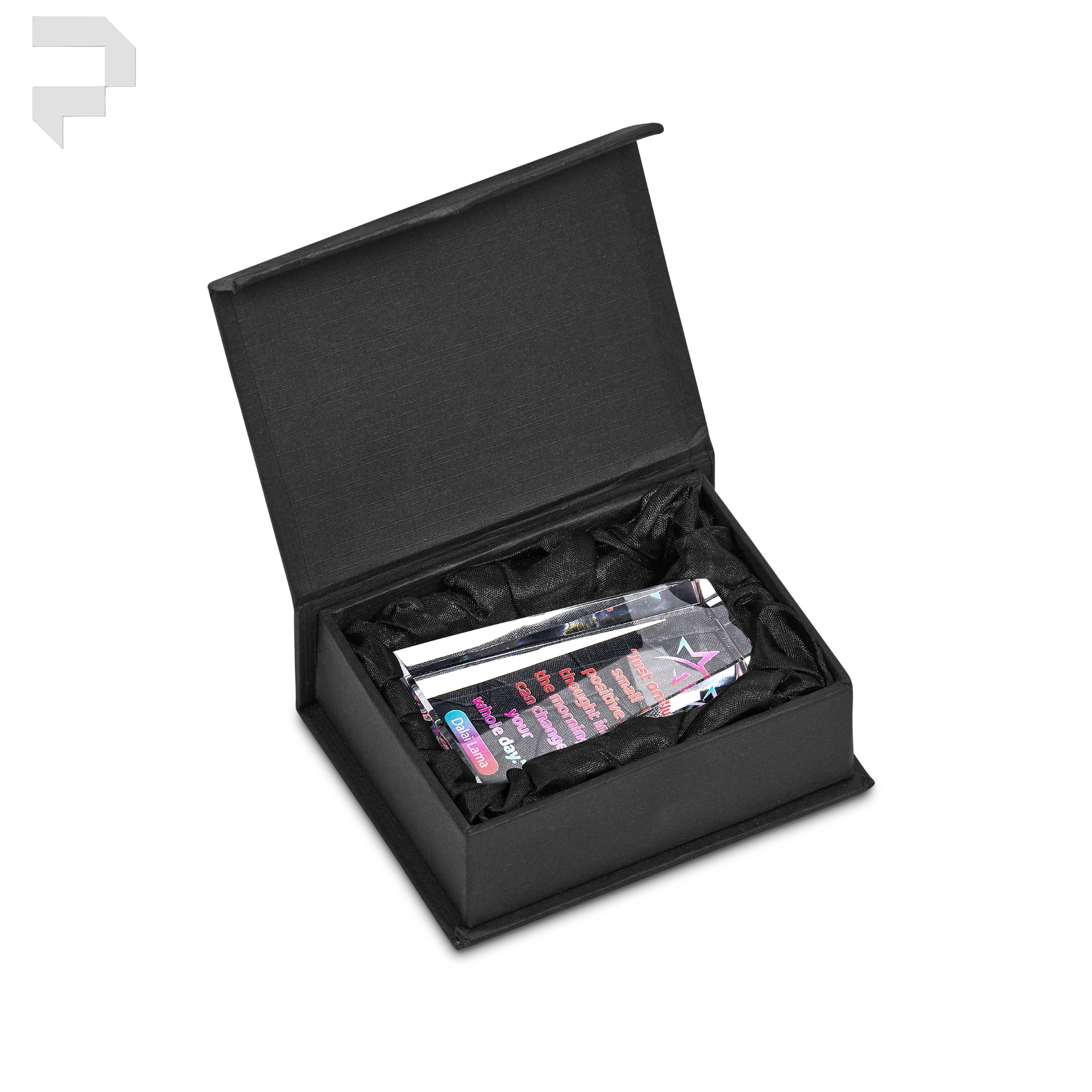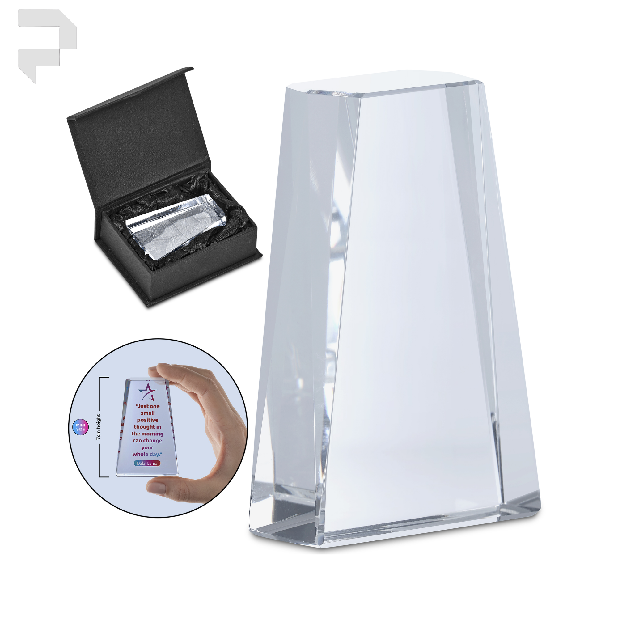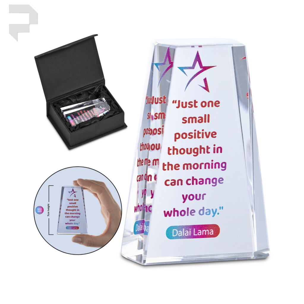 This Mini Award gives employers or suppliers the chance to convey a message that can be kept on the desk or displayed in the office of an employee or client. Ideal for motivational or appreciation messages, these items are offered with colourful digital branding. Each mini award is presented in a smart black box with an elegant and protective padded satin inner.