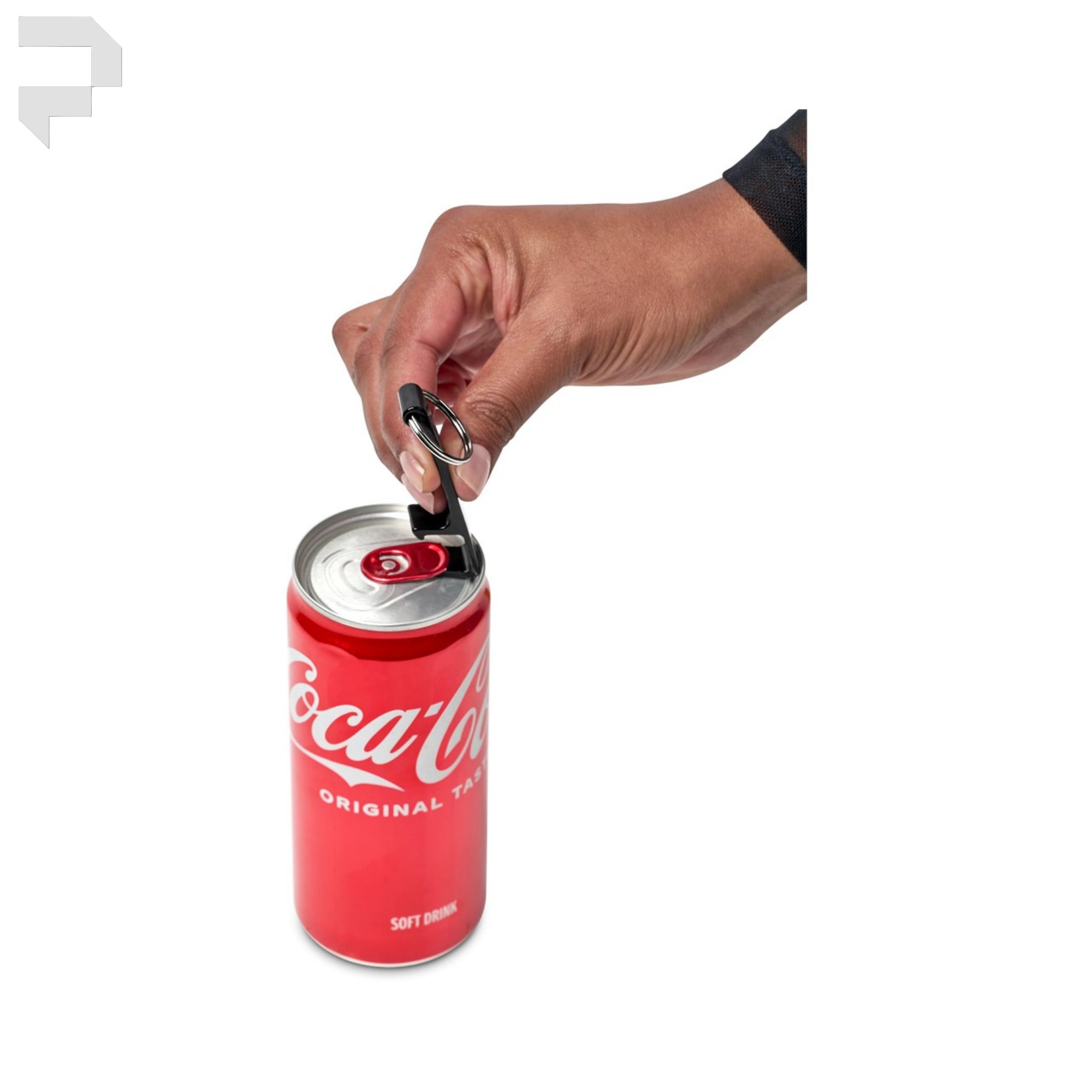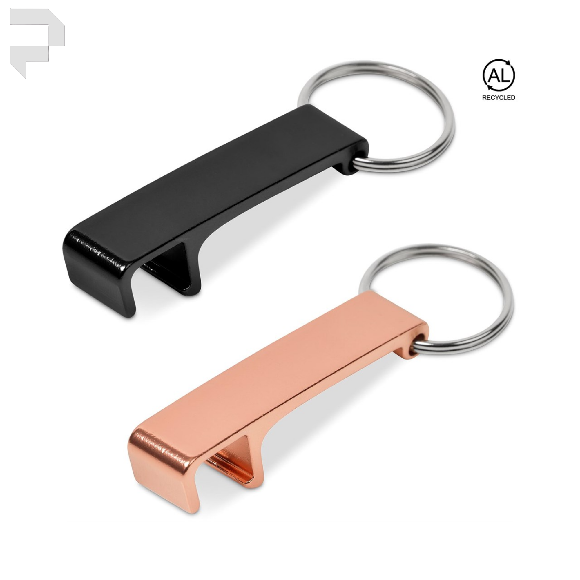 A 4-in-1 keyholder, bottle opener, beverage can tab lifter and phone stand made from recycled aluminium. This item is supplied with a removable QR code tag, which the user can scan to view the functions of this multipurpose keyholder.