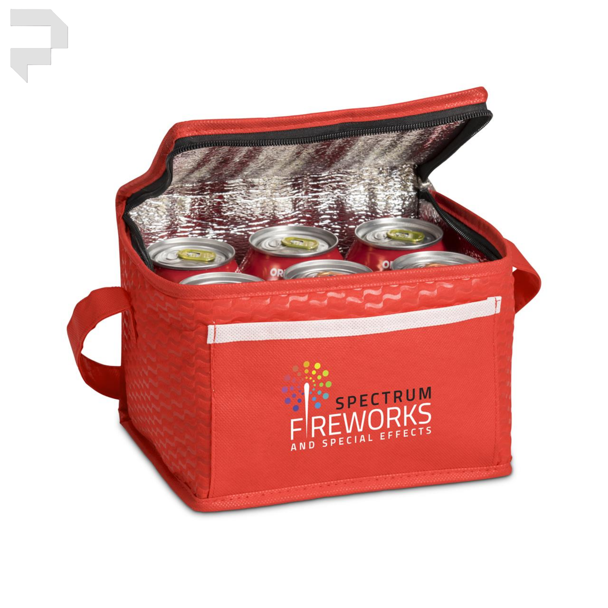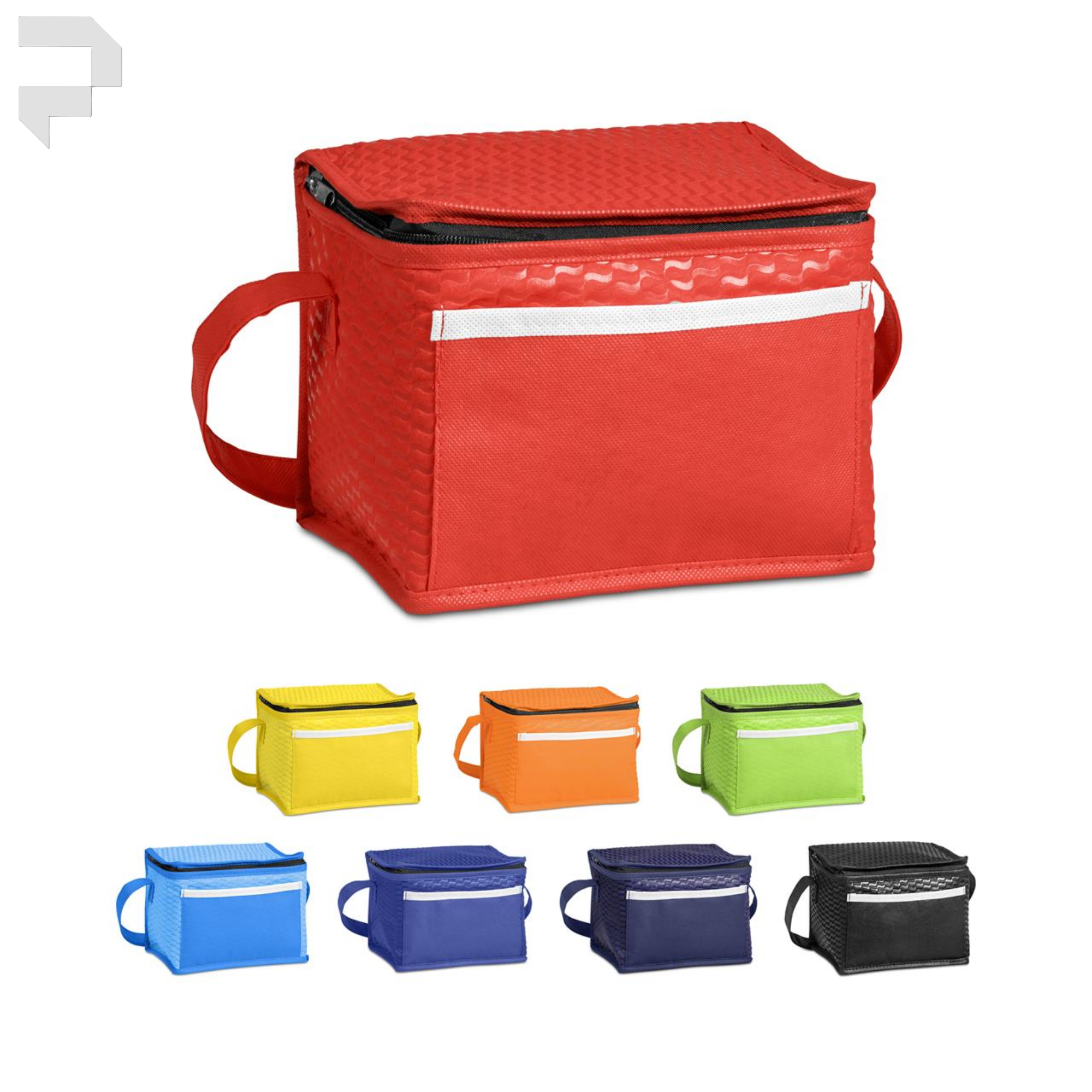 6 can printed non-woven fabric with aluminium foil lining, front pocket with contrast binding on pocket, main zip closure, and self fabric strap.