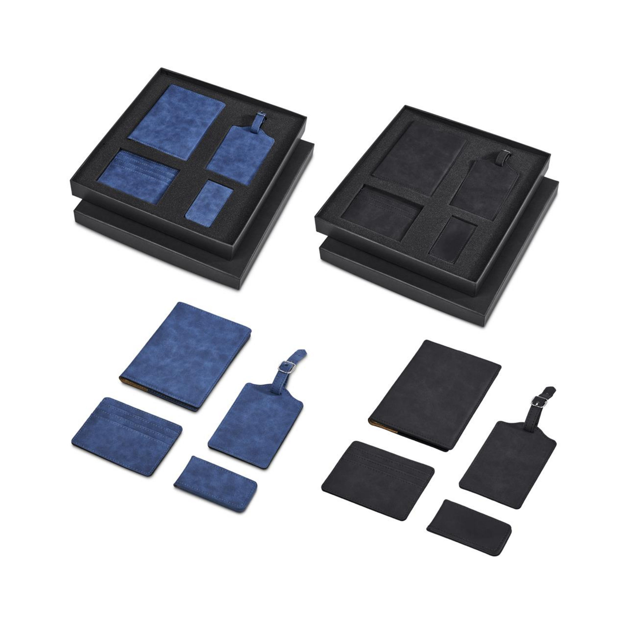 This travel set includes a passport holder, luggage tag, card holder, and money clip, elegantly presented together in a black two-piece gift box. Each item is securely held in place by a custom sponge tray, ensuring a stylish and organised presentation. The 4 items are designed for debossing branding with the same logo of the same size on each item, to save on producing multiple dies.