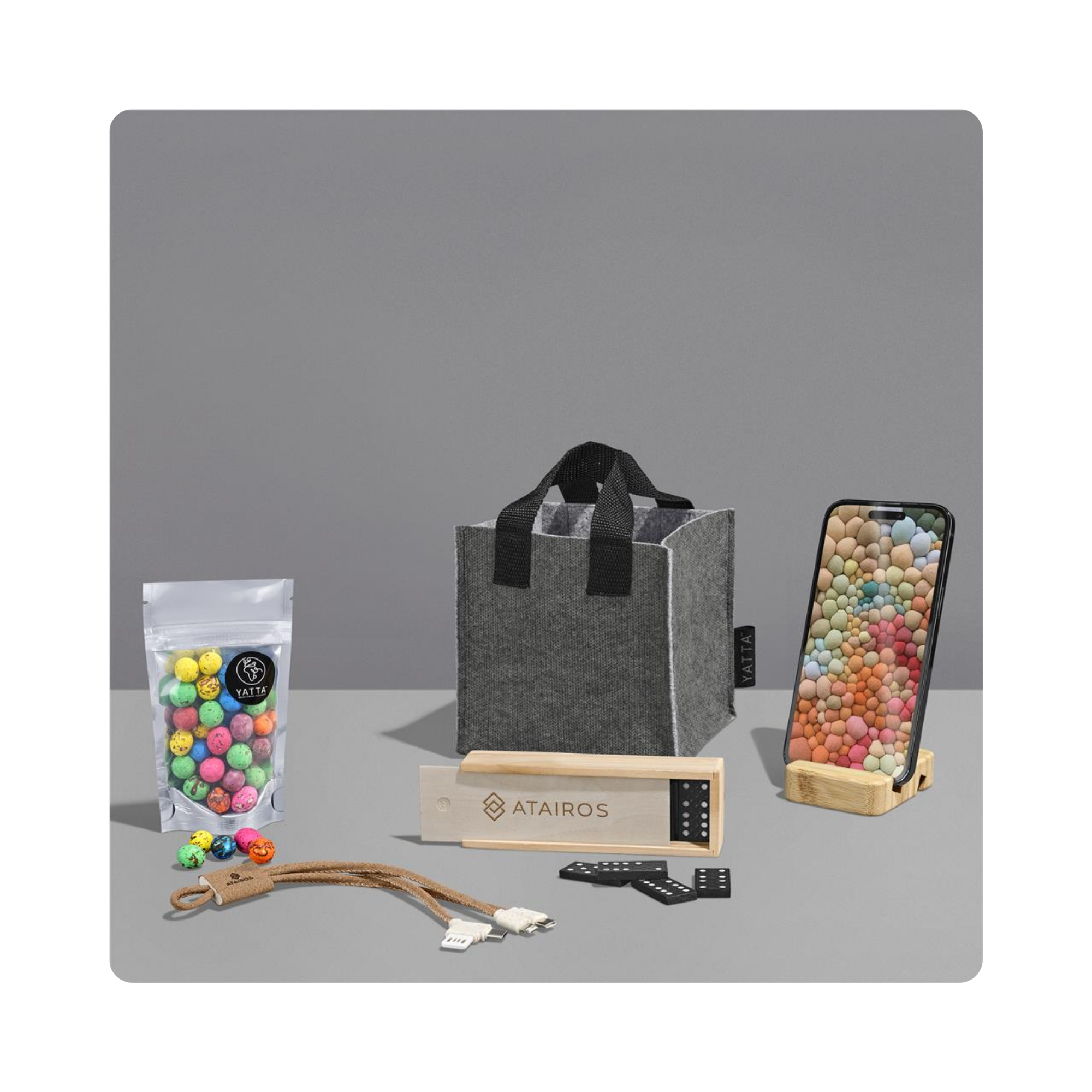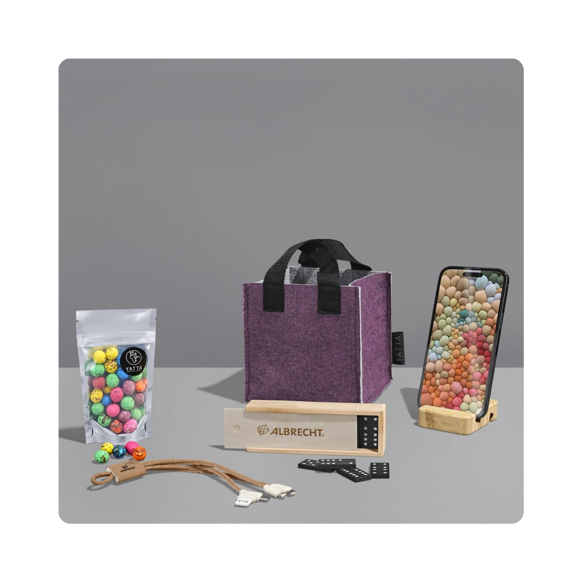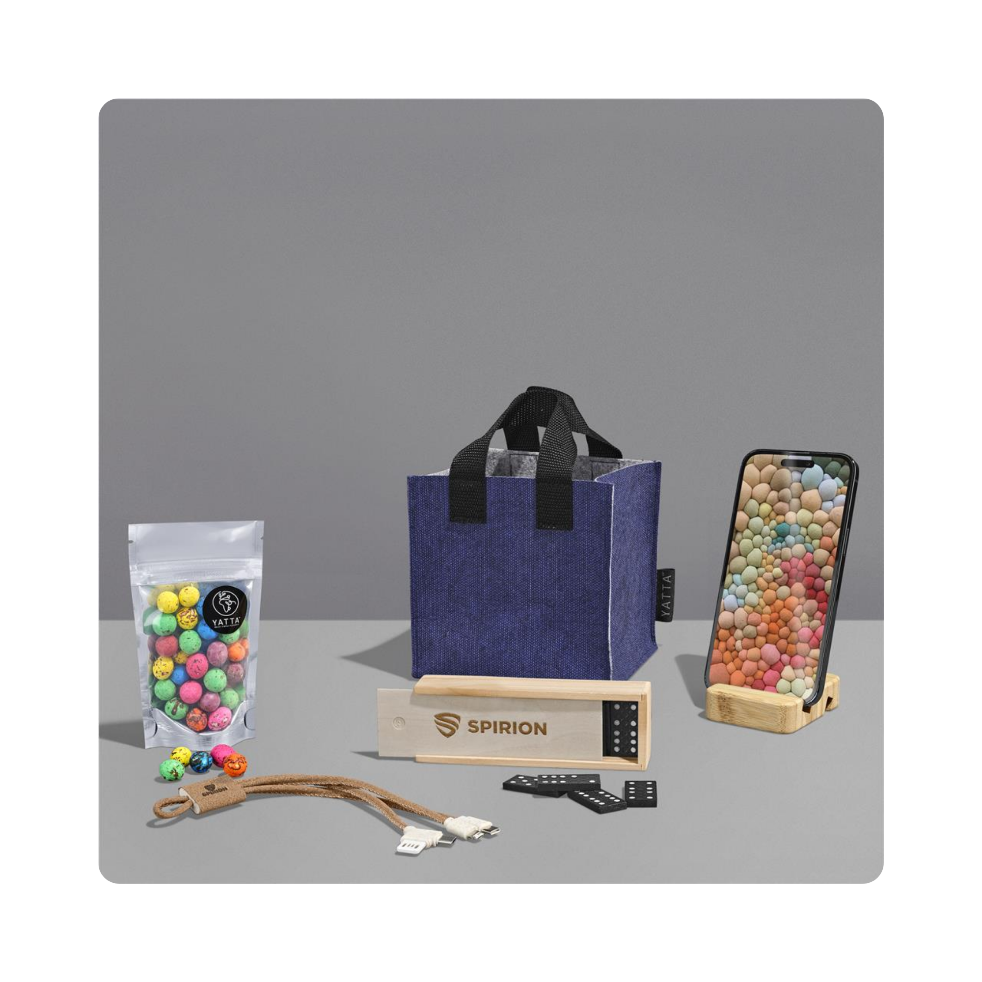 The Yatta range of hampers is expertly crafted to provide a delightful experience with a curated selection of premium items and edible treats. The contents are elegantly presented in a Yatta sublimated RPET felt mini gift bag.